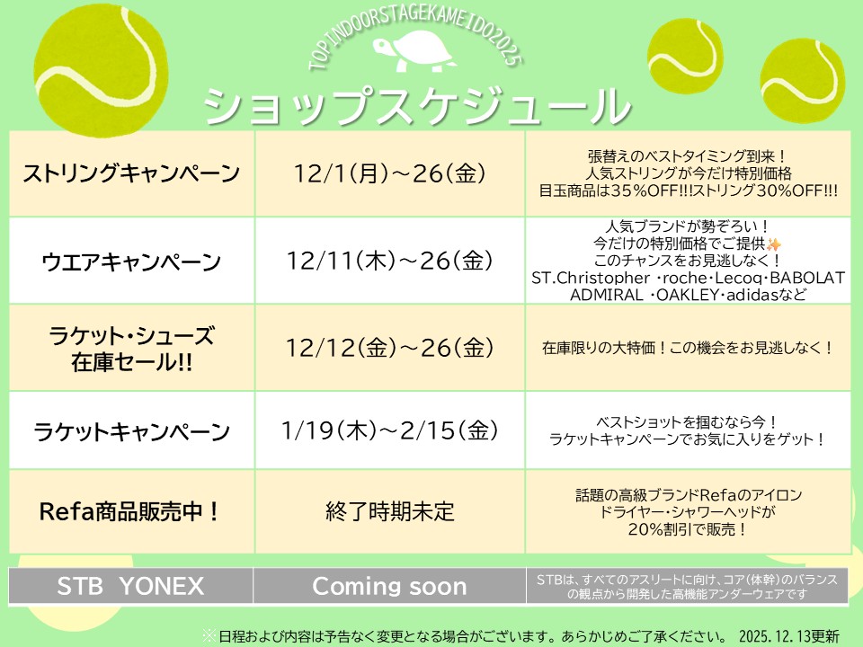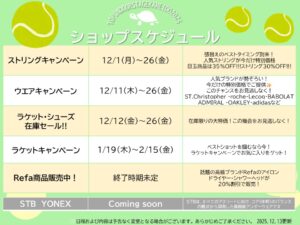 【テニス・ゴルフ】ショップスケジュール