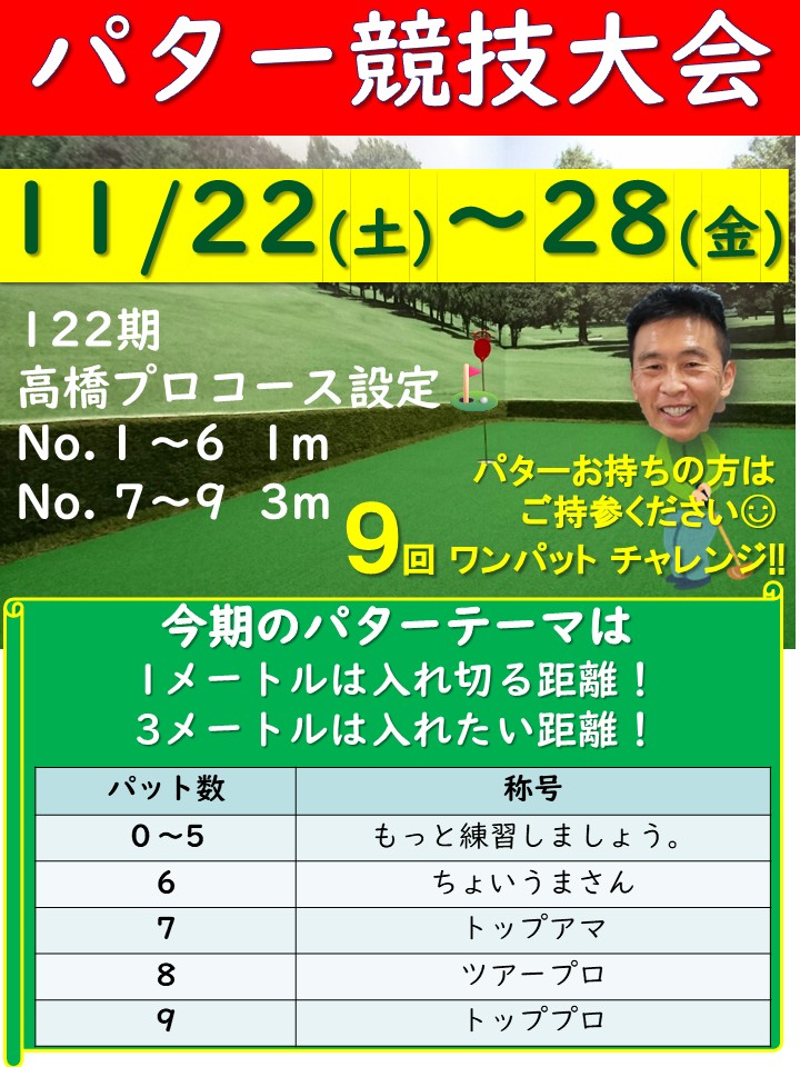 対象 ゴルフ会員様、体験者様 日時 11/22(土)~28(金) レッスン中に実施いたします。 9回ワンパットチャレンジ!!成功の数で景品GET ゴルフの腕試し、今こそ本番!