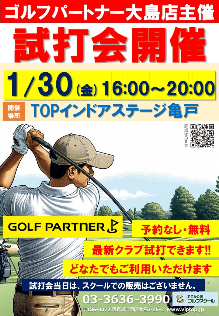 無料体験試打会・セッティング相談会開催!! ゴルフパートナー大島店様来店 開催日 1月30日(金) 時 間 16:00~20:00 どなたでもご利用いただけます!!!