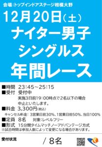 12月20日(土)にナイター男子年間シングルスレースの3回目の大会を行います!