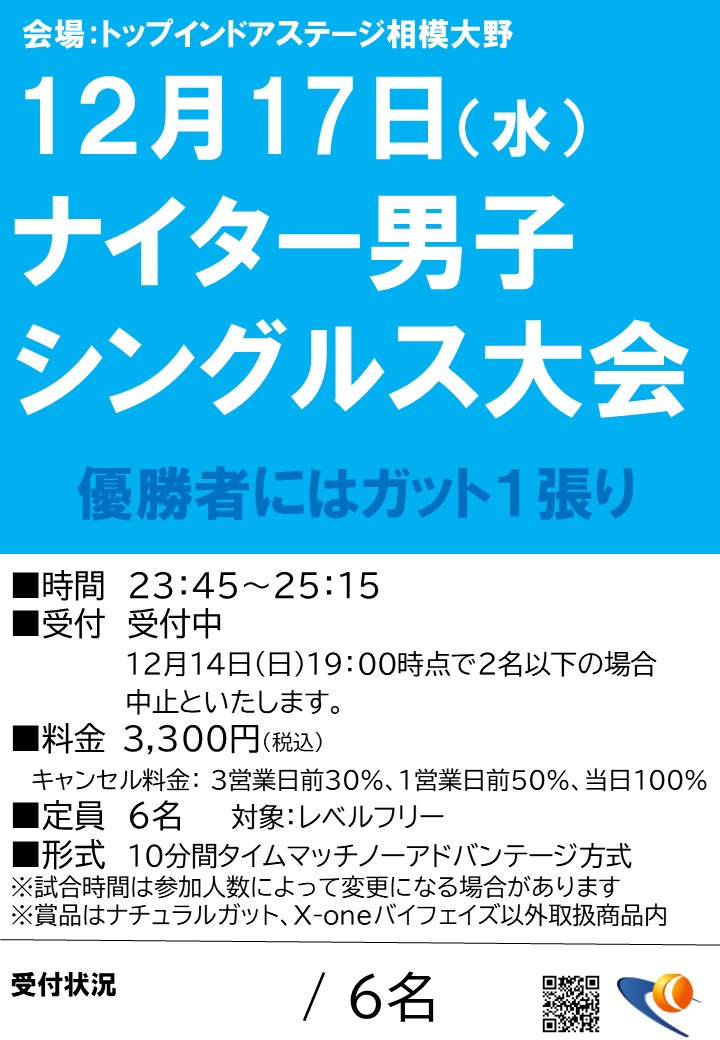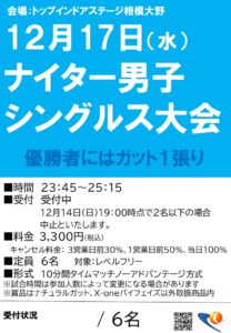12月17日(水)に水曜日ナイターシングルスを開催します。