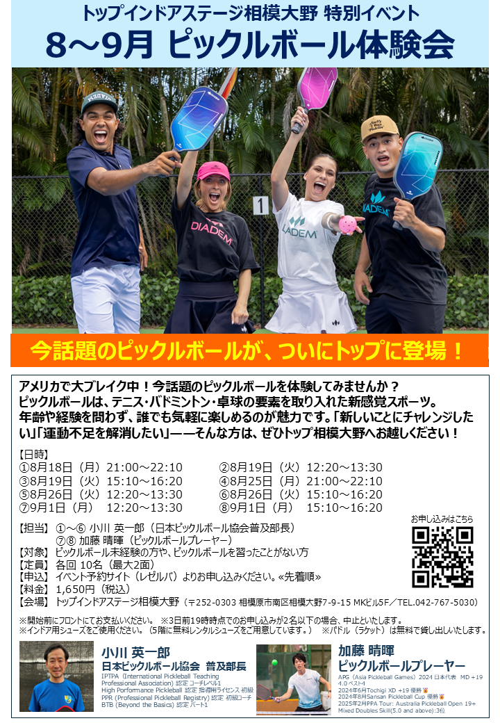 「新しいことにチャレンジしたい」「運動不足を解消したい」——そんな方は、ぜひトップ相模大野でピックルボールを体験してみませんか?