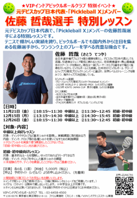元デビスカップ日本代表で「Pickleball X」メンバーの佐藤哲哉選手による特別レッスンを実施いたします。佐藤選手は、テニスで数々の輝かしい実績を残し、現在はピックルボールでも国内外から注目を集めています。確かな技術と豊富な経験に裏打ちされた指導を通じて、ワンランク上のプレーを学べる貴重な機会です。
