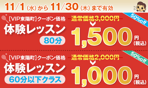 体験レッスン料 80分のクラス 3,000円1,500円 60分以下のクラス 2,000円1,000円 上記割引は2月28日(土)までに受講された方が対象です。 表示料金は税込の金額です。 未成年の方が受講される場合は、保護者の方の同意が必要となります。